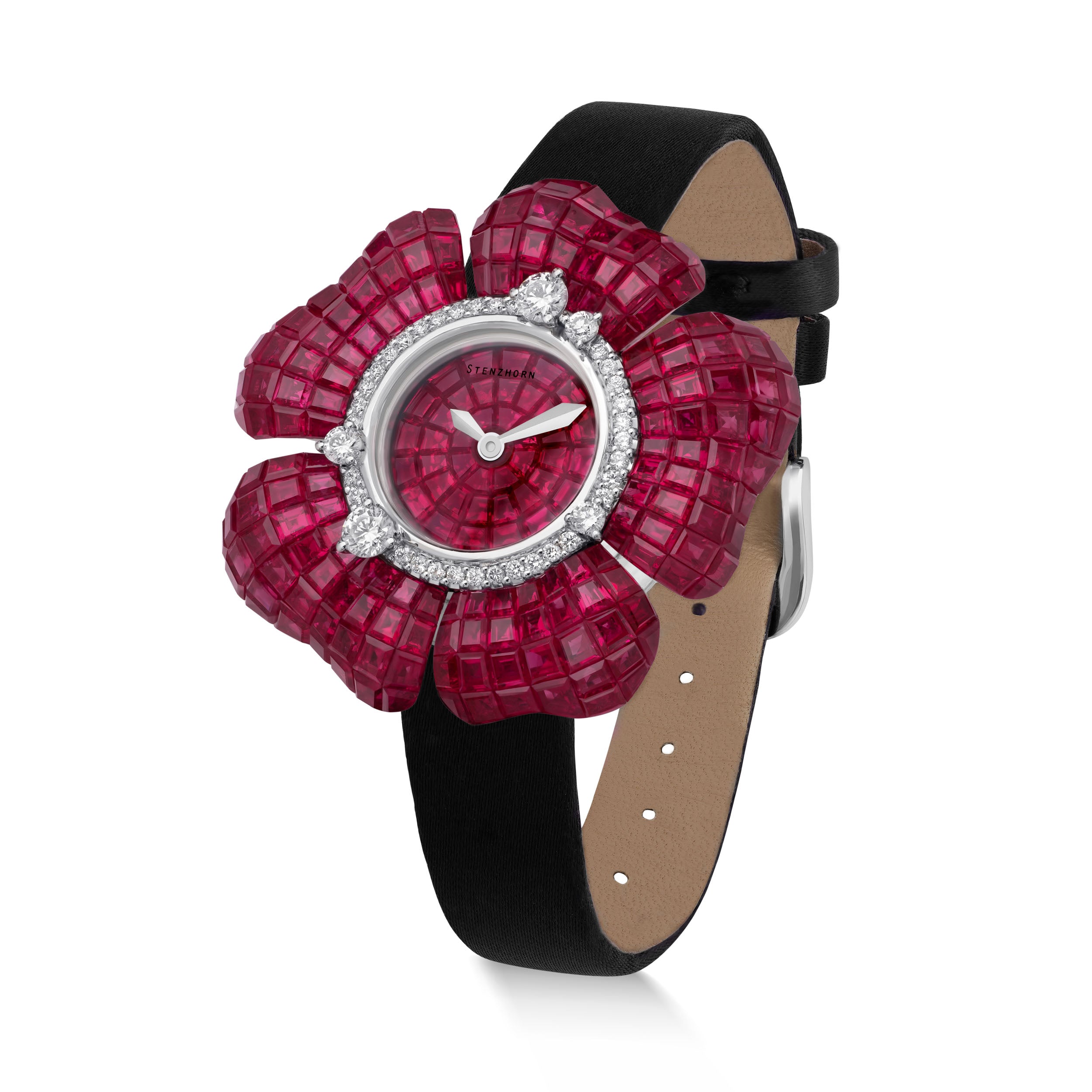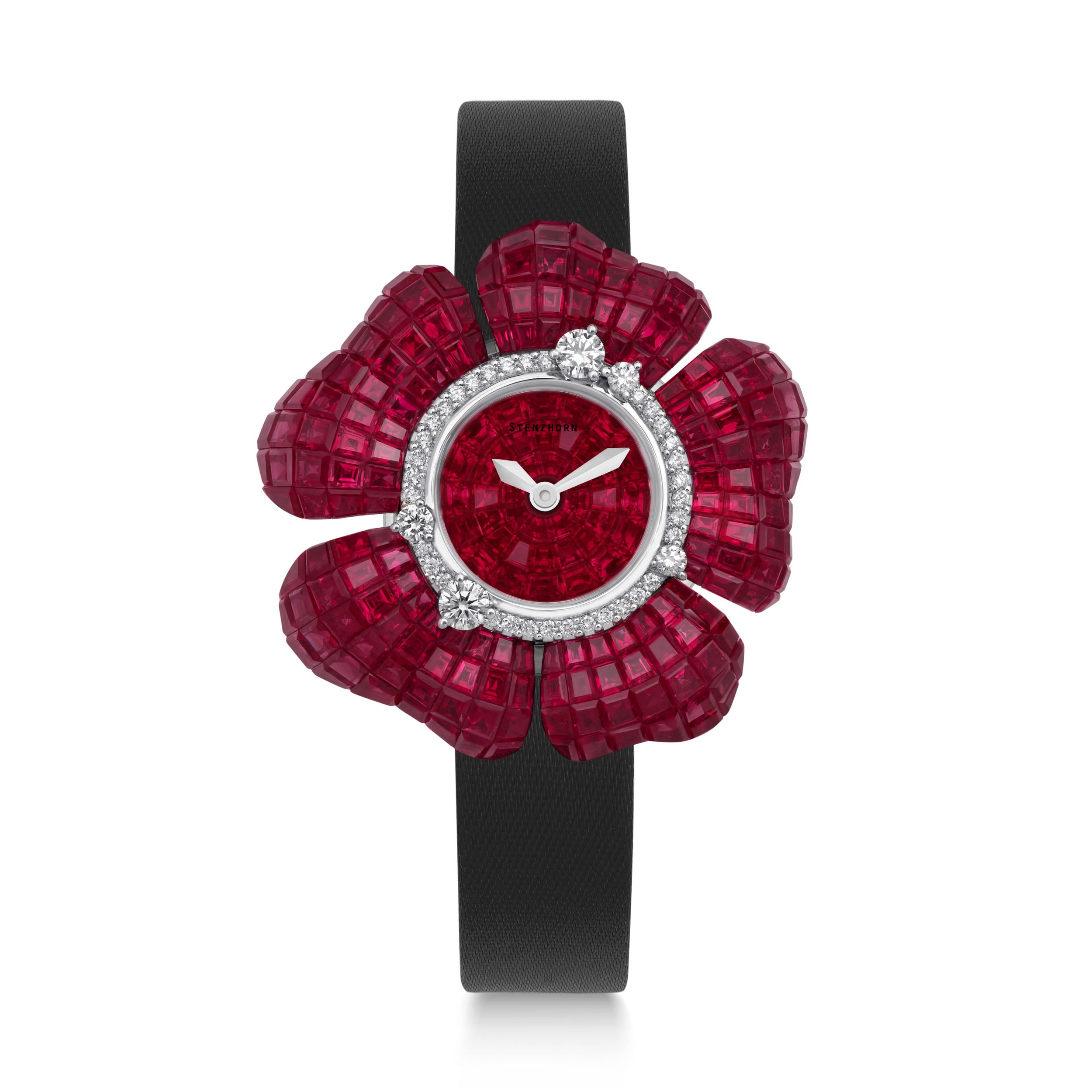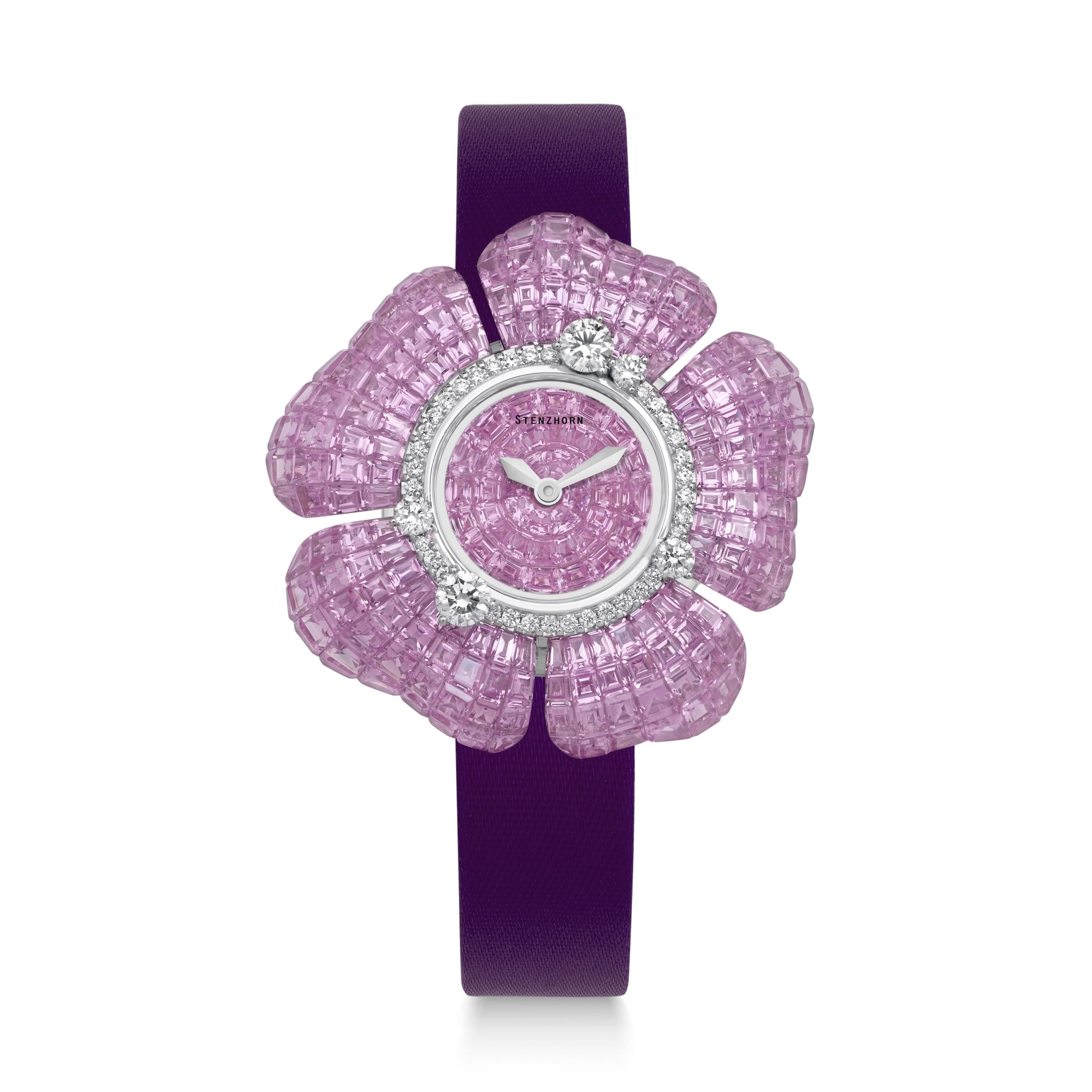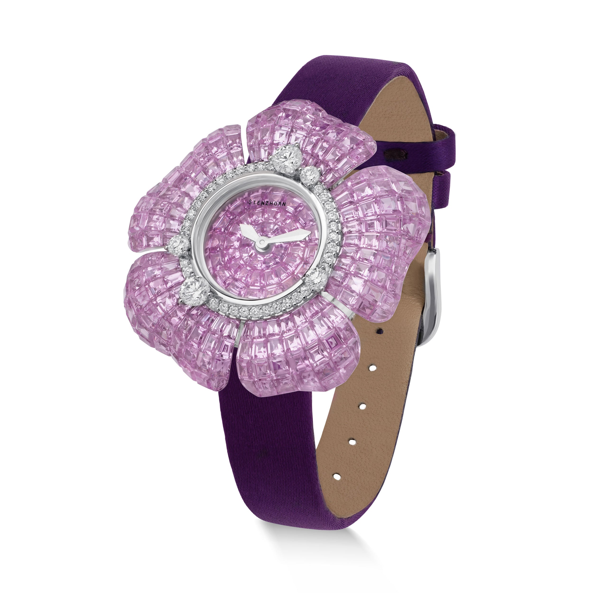 Introducing the Floral Watch, where flawlessly crafted petals reveal nature's treasure in the most enchanting way. This watch perfectly blends Stenzhorn's iconic gem-laden blooms and exquisite craftsmanship. Inspired by the renowned Floral collections, the Floral watch takes beauty to new heights with its soft, invisibly set rubies, precious sapphire petals, and sparkling diamonds.