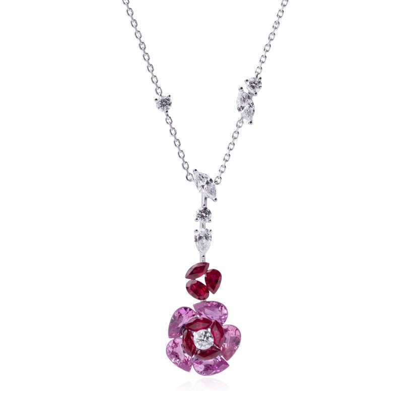 In dieser Kollektion werden rosafarbene und rote Rosenblätter aus intensiven marquise-, ovalen- und birnenförmigen rosa Saphiren und Rubinen von einem funkelnden zentralen Diamanten unterbrochen, der die Stempel der Blume darstellt.