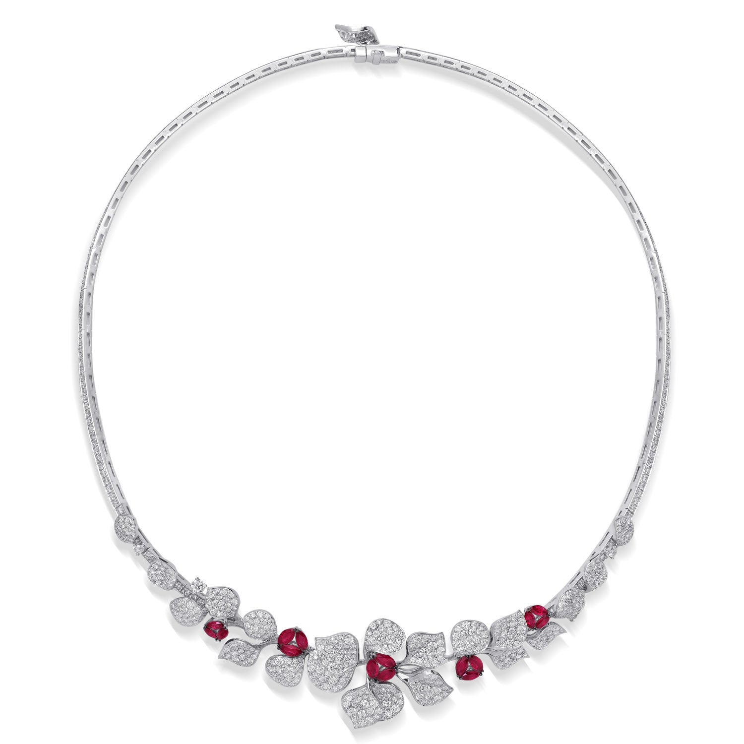 The À Fleur de Paris Ruby Collier is a radiant celebration of Parisian spring, featuring a delicate arrangement of blooming petals. Crafted in 18k gold, the necklace showcases an intricate cascade of pavé-set diamond flowers, their petals shimmering with brilliance. Vibrant marquise-cut rubies at the heart of each bloom add a striking touch of color, symbolizing passion and vitality. Designed with an elegant, close-fitting silhouette, this necklace exudes timeless sophistication and is perfect for making a statement on any occasion.