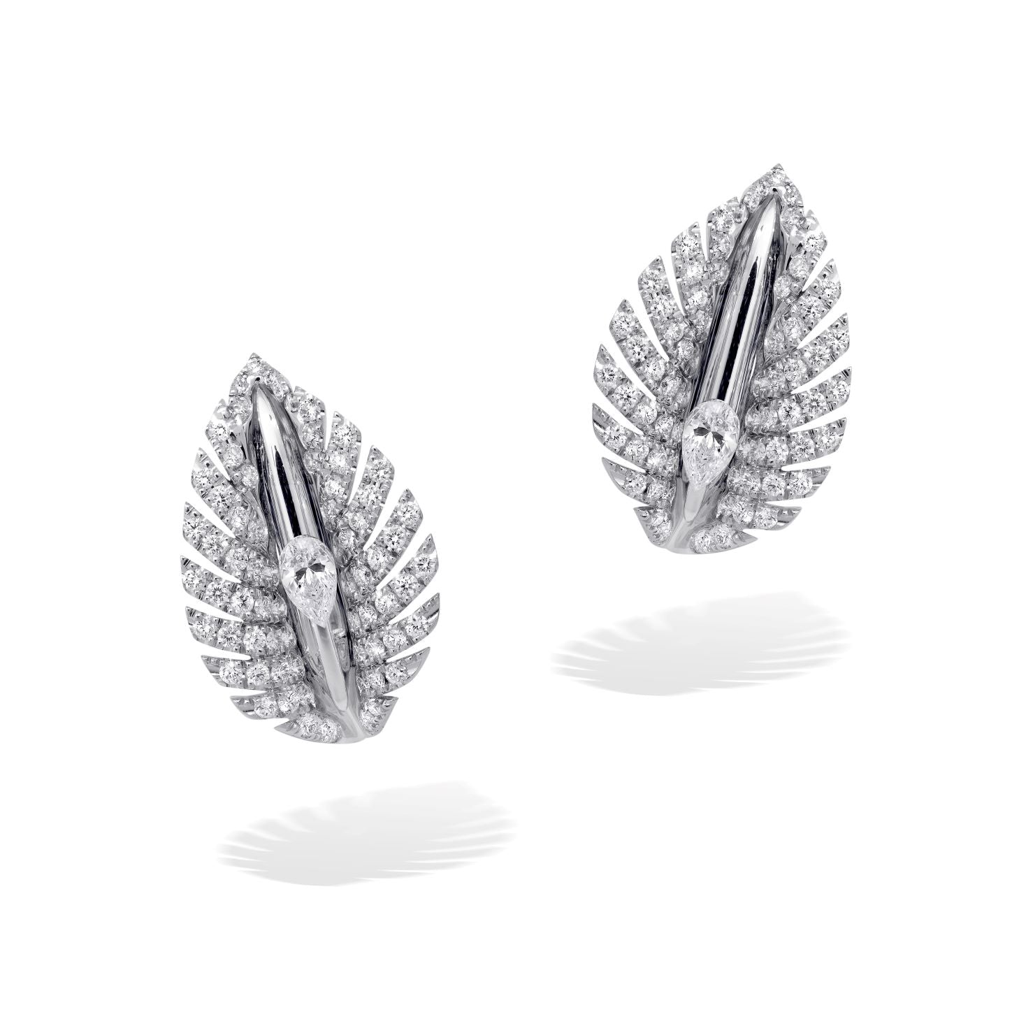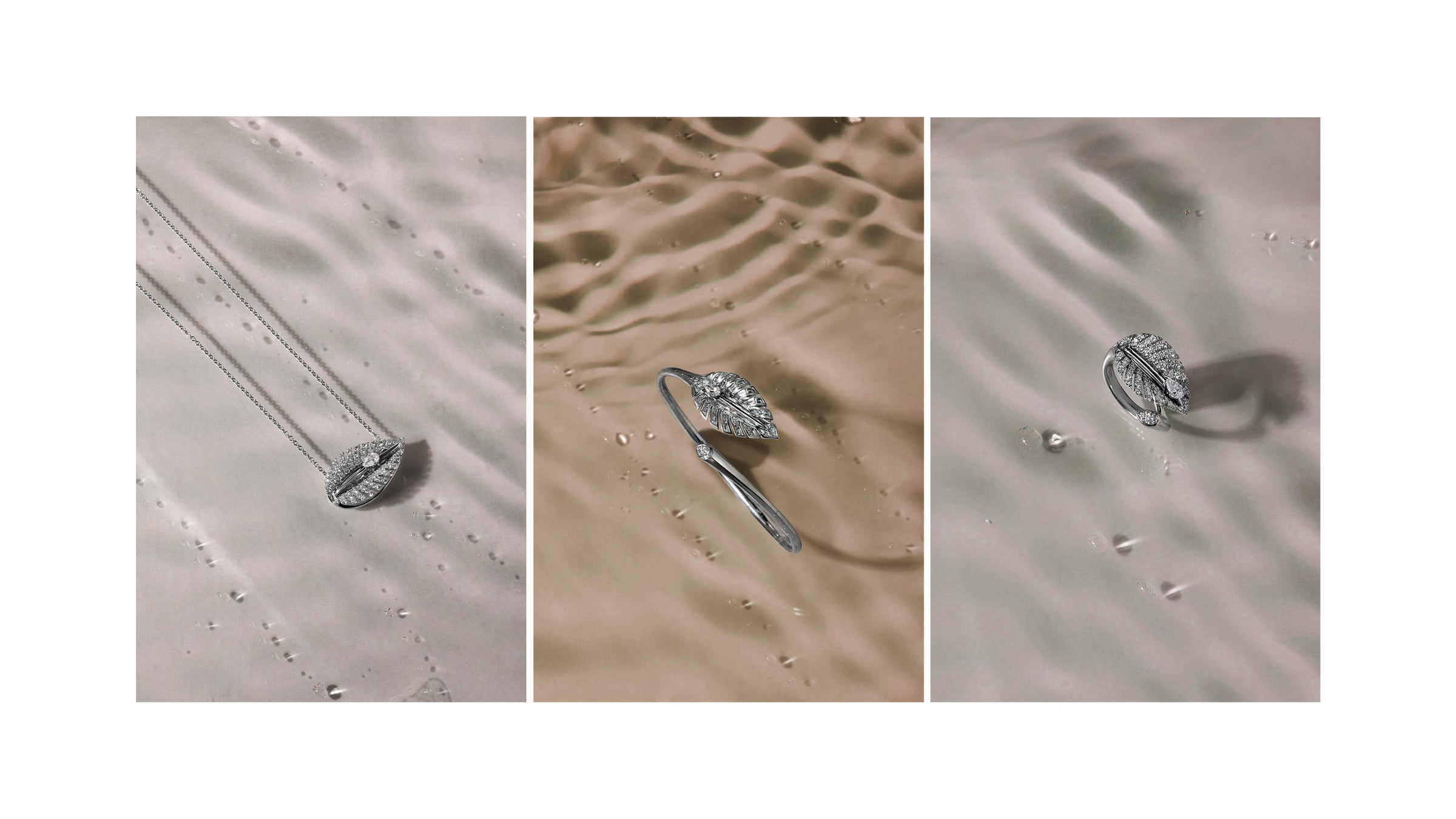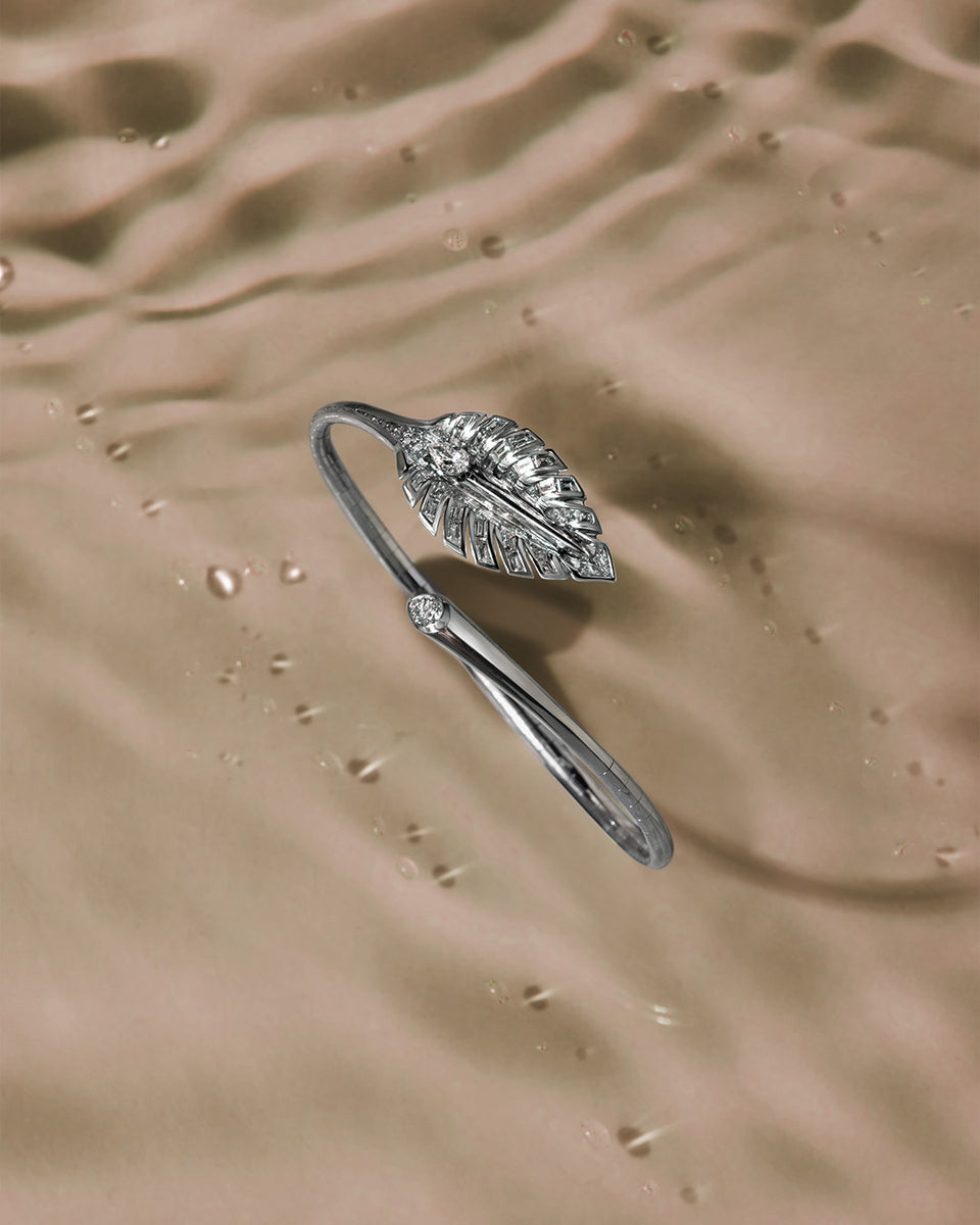 Specially designed to cool you down for any occasion, an invisible set of pear-shaped diamonds is cut to move you, like the trickle of tiny water bubbles, down a leaf. The designs of this collection are inspired by the beautiful foliage of Hastas, a family of plantain lilies native to Japan, Korea, and China. Hosta plants symbolise friendship and devotion.