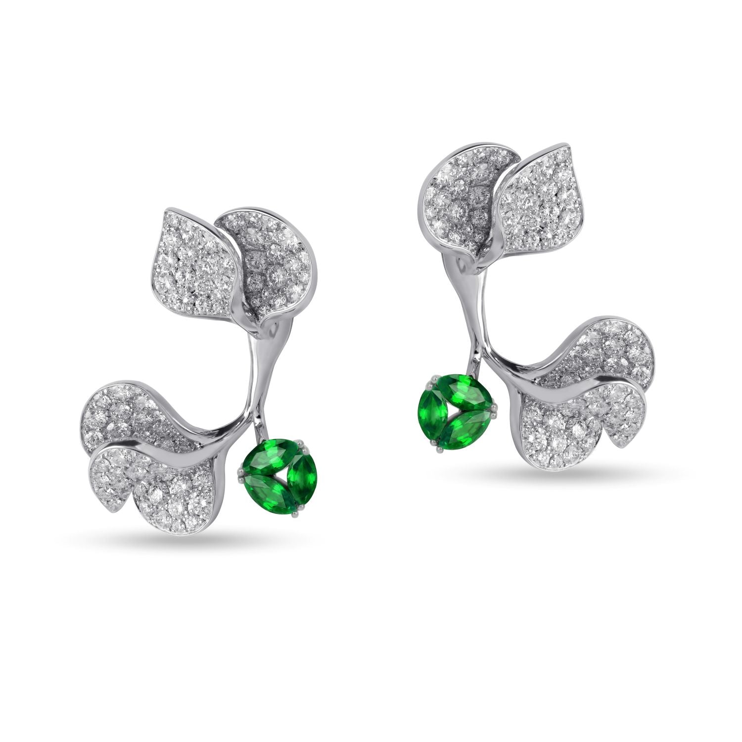 The À Fleur de Paris Double Earrings embody the essence of spring’s awakening, with petals gracefully unfurling to reveal vibrant colour and brilliance. Crafted in 18k gold, each earring features delicately curved petals adorned with pavé-set diamonds that shimmer with life. At the heart of each bloom, three marquise-cut tsavorites create a striking focal point, representing passion and vitality. Perfectly balanced between timeless elegance and fresh, modern design, these earrings are a radiant tribute to the beauty of renewal and romance.