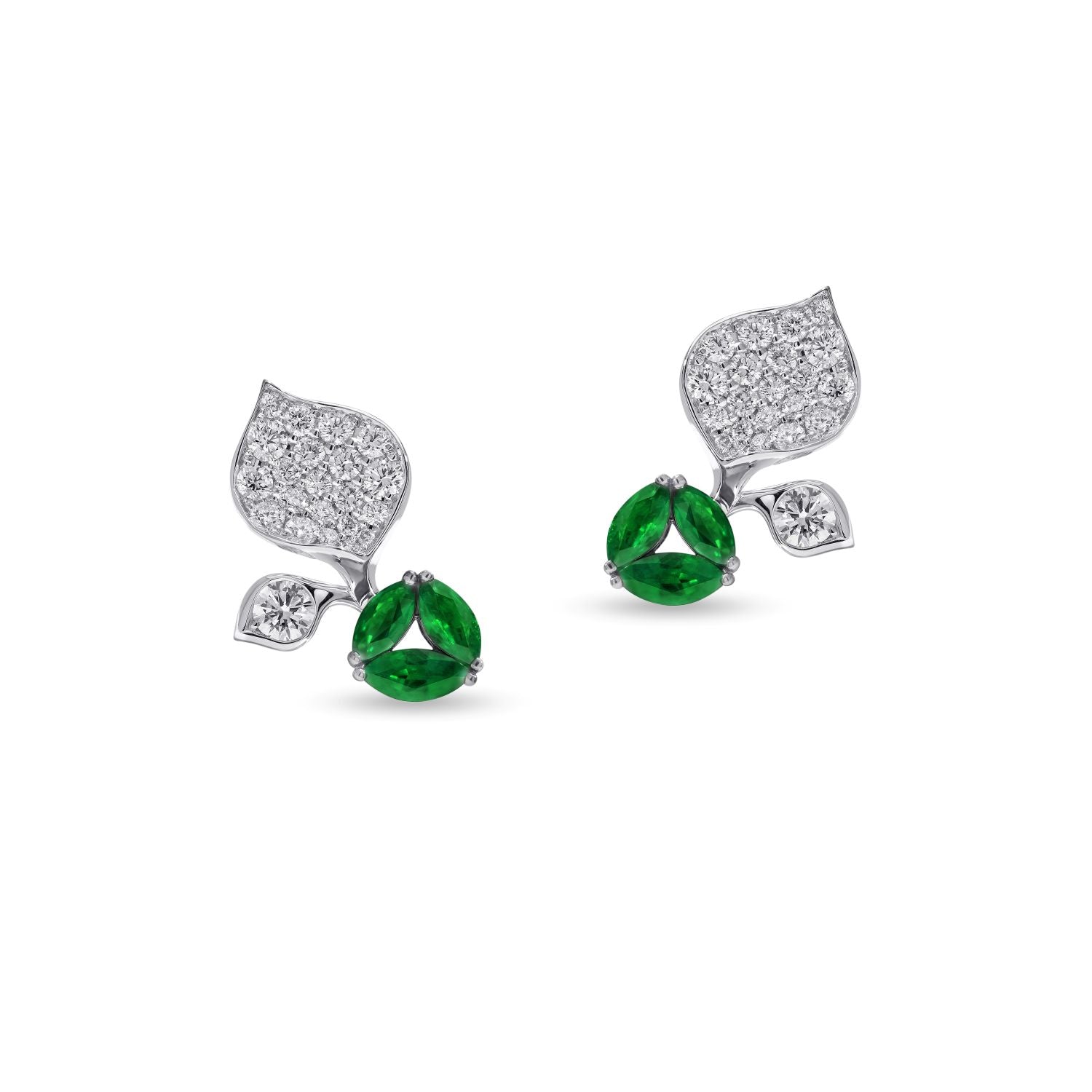 À Fleur de Parisスタッドピアスは、控えめなエレガンスの典型です。パヴェセッティングされたダイヤモンドの花びらと、鮮やかなマーキスカットのツァボライトのトリオが、遊び心がありながらも洗練された印象を与えます。華奢なサイズなのでデイリー使いに最適で、さりげなく色と輝きを添えます。