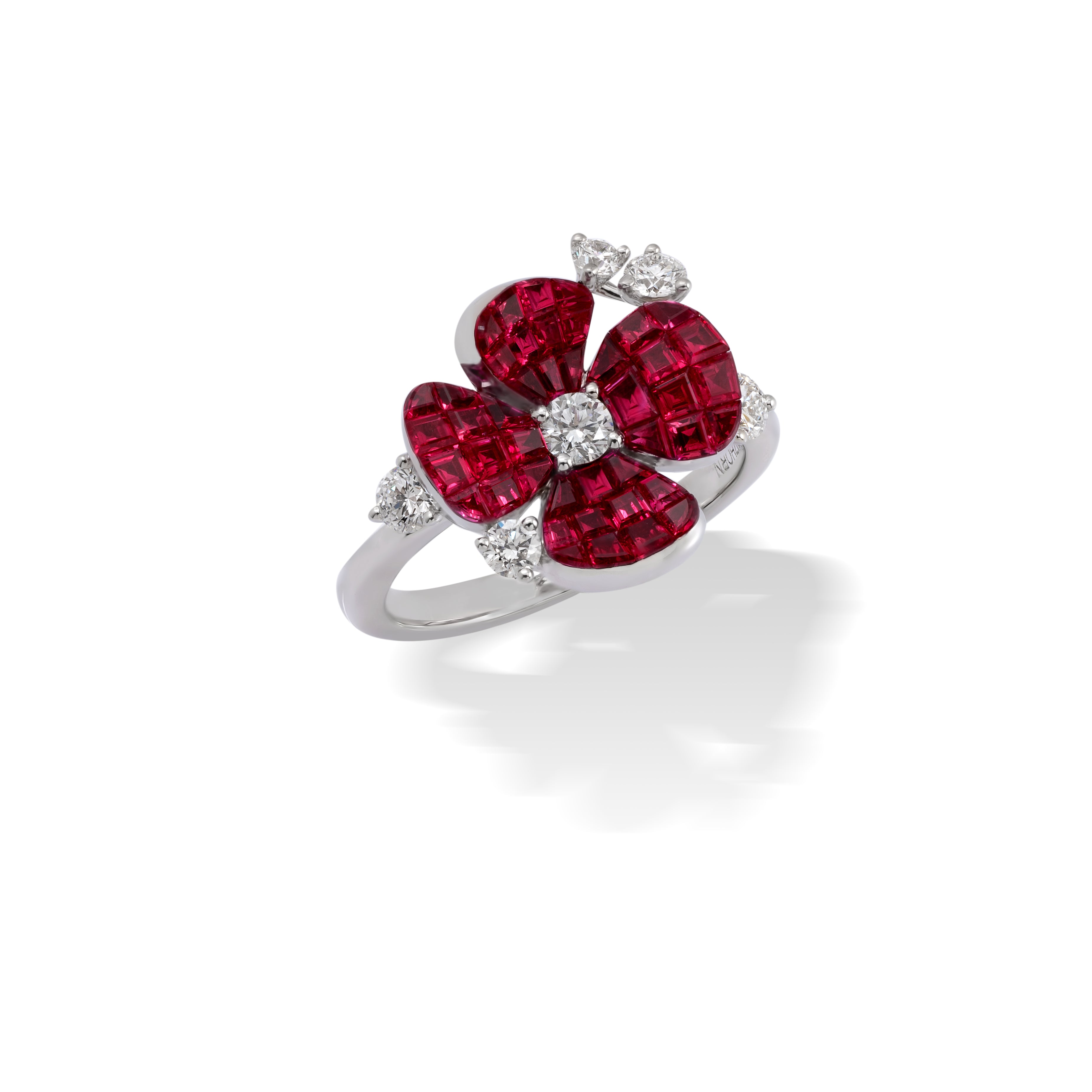 ステンツホルンは、この壮大な花々の創造的なムードをとらえ、ダイヤモンドとルビーの豪華さを通して、その遊び心と豊かさを表現しています。