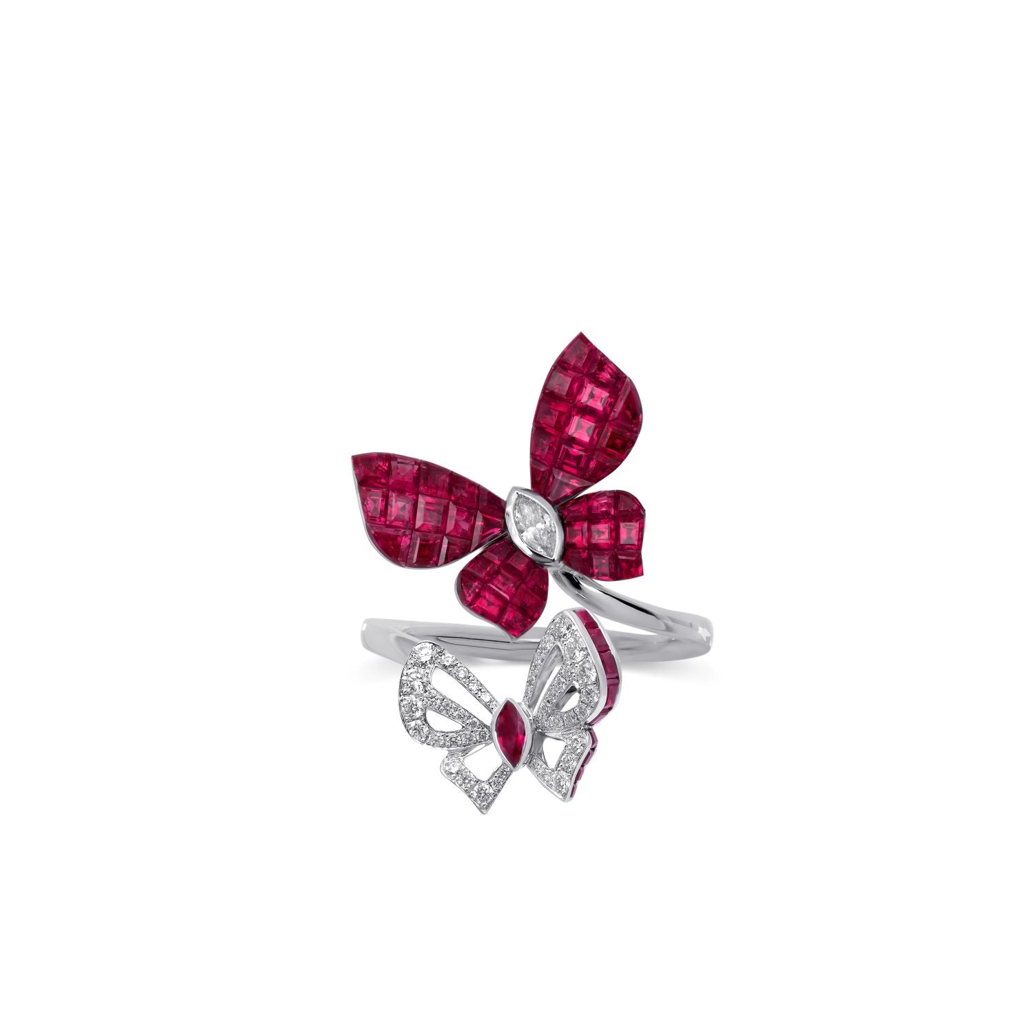 インビジブルセッティングされたルビーの繊細なレールが蝶の羽の繊細な葉脈をなぞり、一粒のマーキスカットダイヤモンドや鮮やかなカラーストーンがその優美なボディを形作っています。