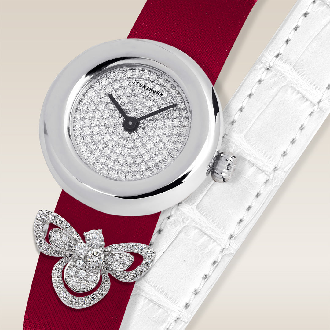 ステンツォルンの宝石をあしらった時計は、精巧なジュエリーと洗練されたタイムピースの完璧な融合を表現しています。芸術への情熱、官能性、美への感性が反映されています。すべての時計は、精巧で大胆な趣味を持つ、現代的で自意識の高い女性に捧げられ、賞賛を込めて作られています。ステンツホルンの伝統的な工房では、熟練した職人がひとつひとつの時計を最高水準で丁寧に組み立て、時を告げるきらめくジュエリーの彫刻へと昇華させています。