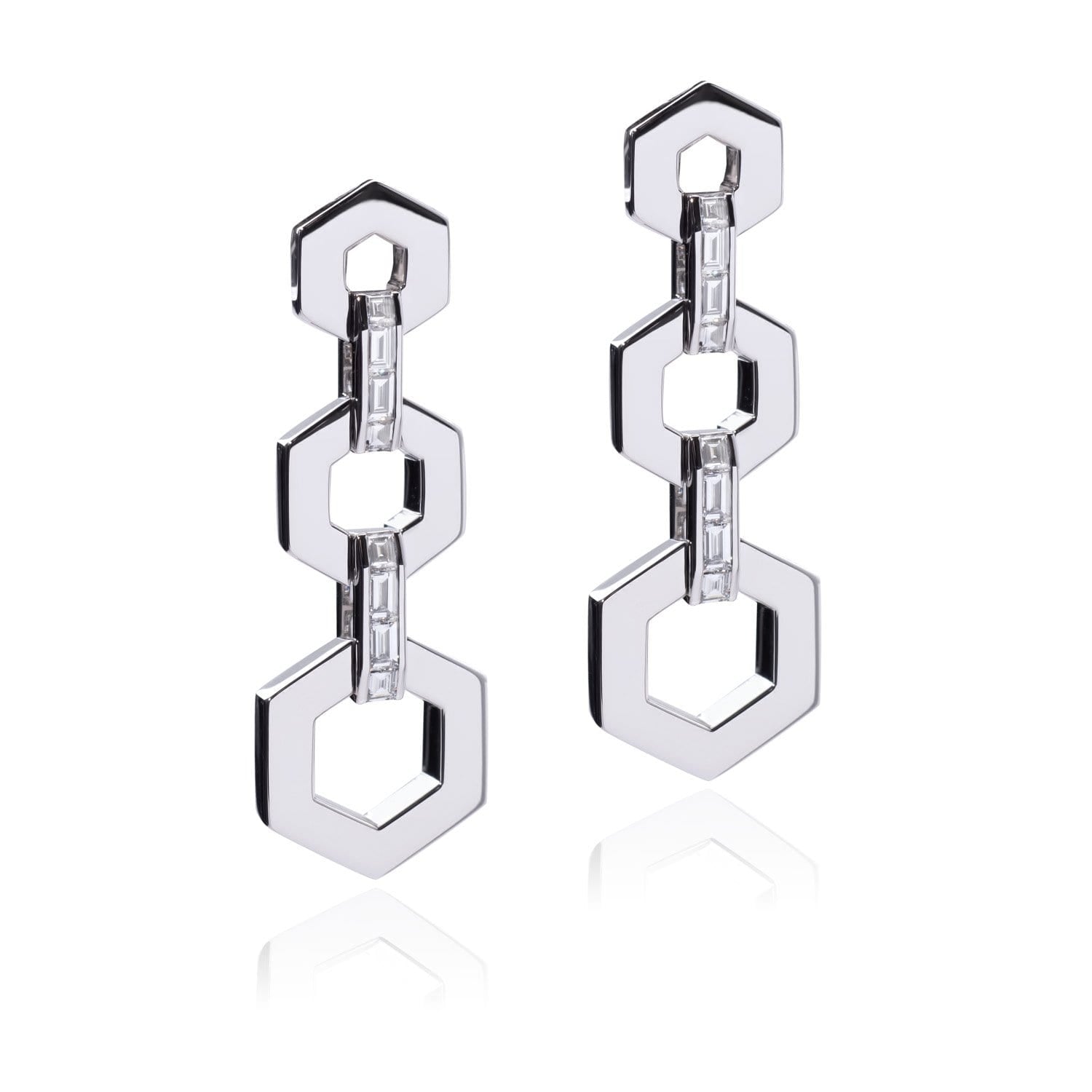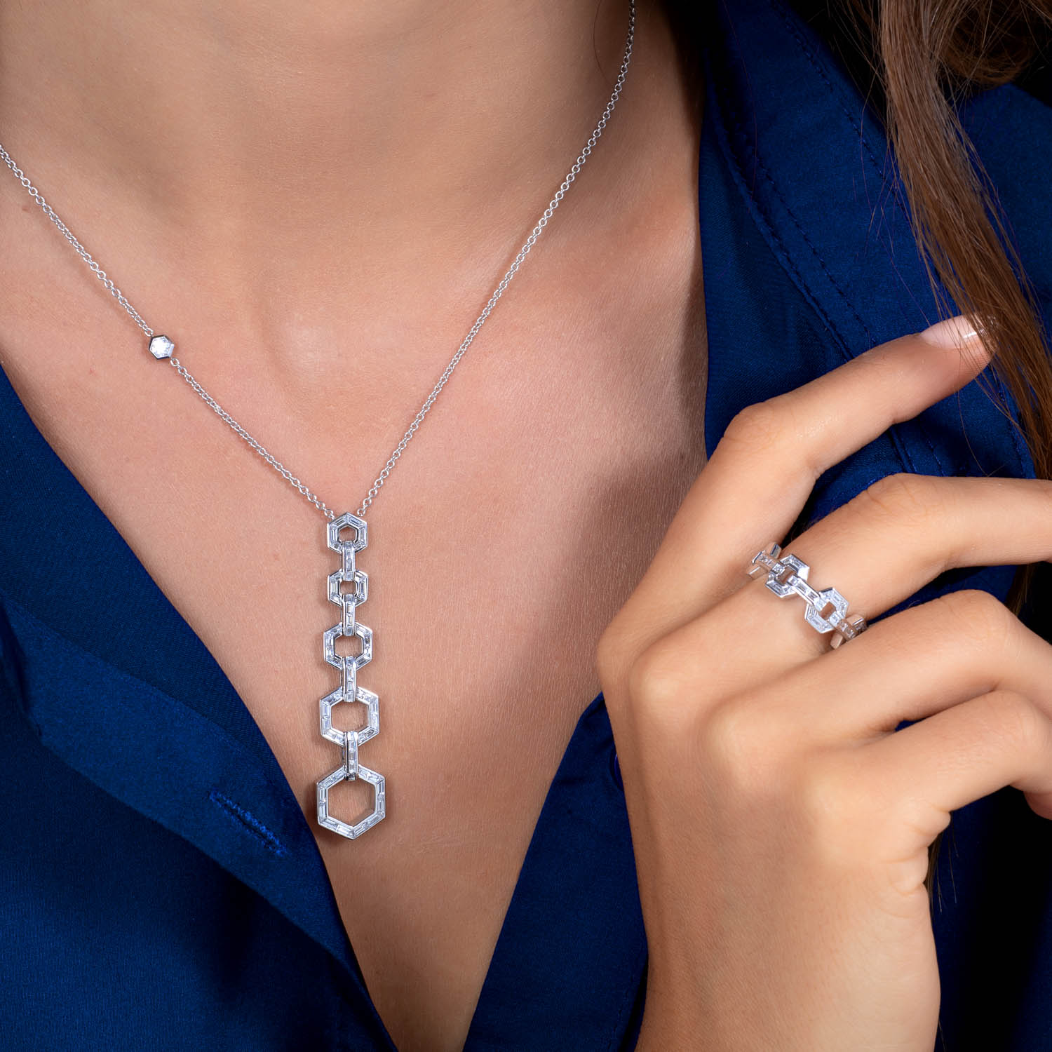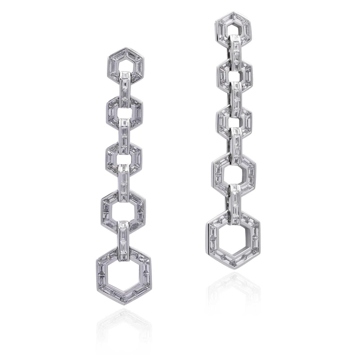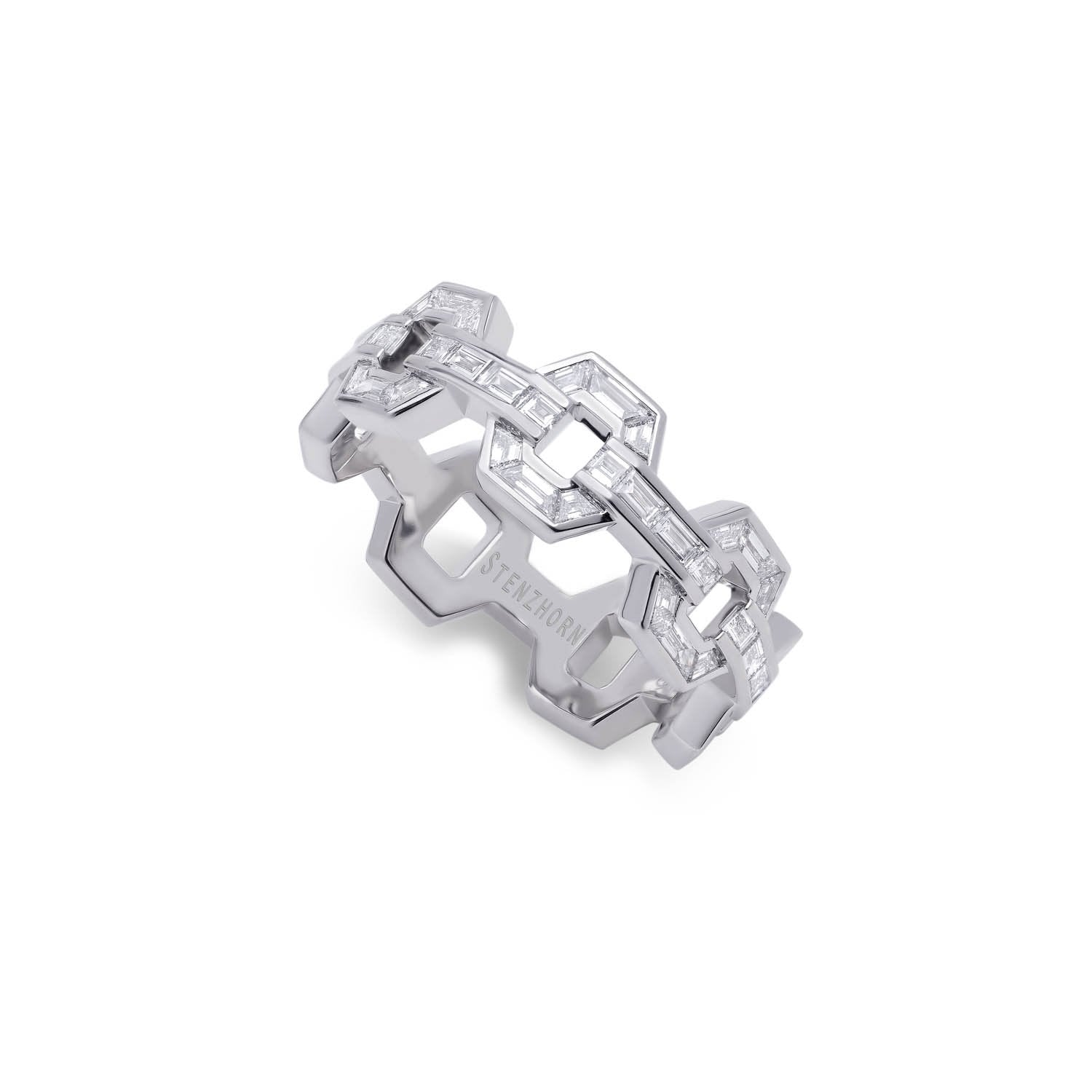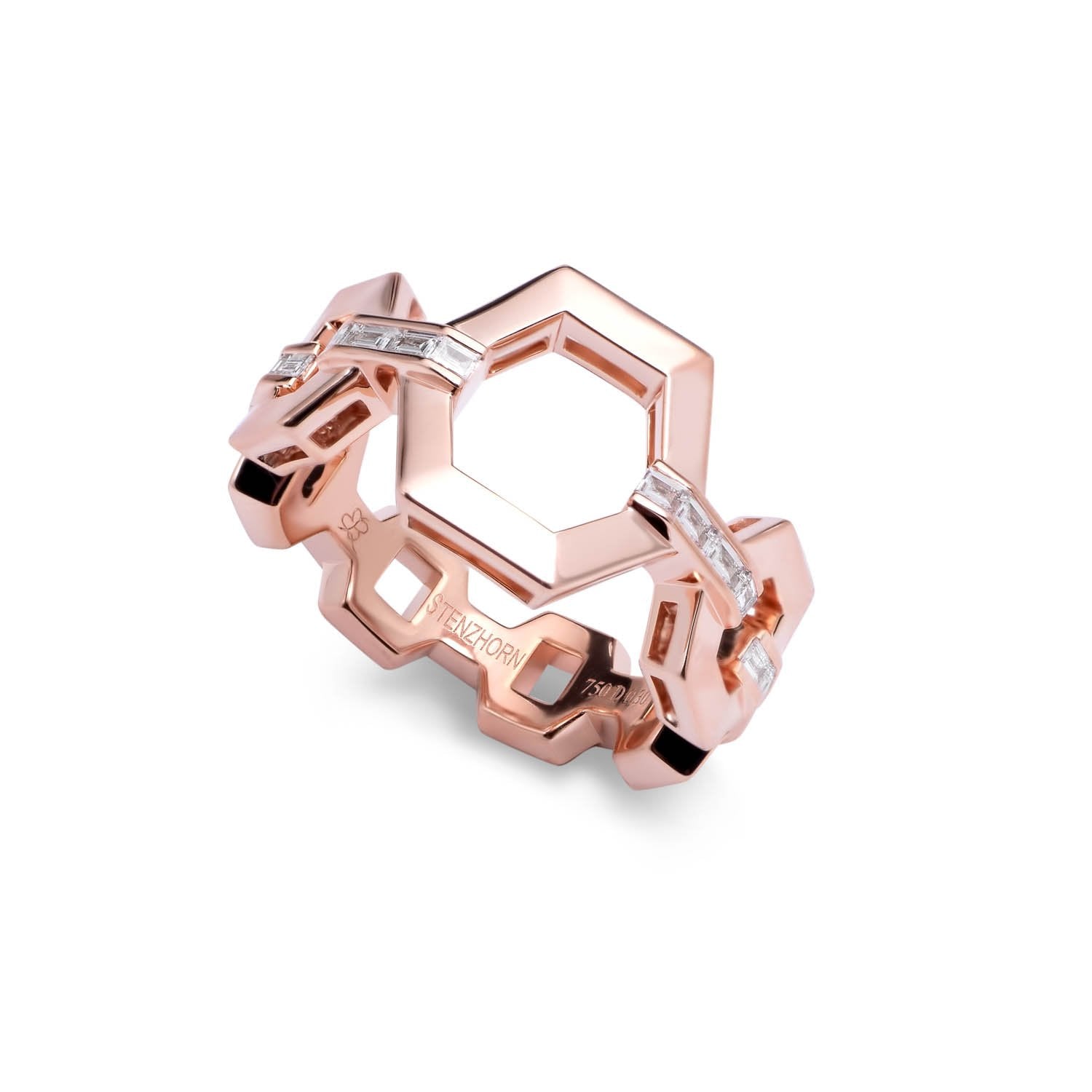 ステンツホルンのHoneyハニー・コレクションは、ミツバチの六角形モチーフを新たな高みへと導きます。ホワイトゴールドと温かみのあるローズゴールド製で、バゲットカットのダイヤモンドがあしらわれている。ビー・マイン・コレクションが進化するにつれ、ミツバチの神聖な構造がステンツホルンのデザインの焦点となりました。