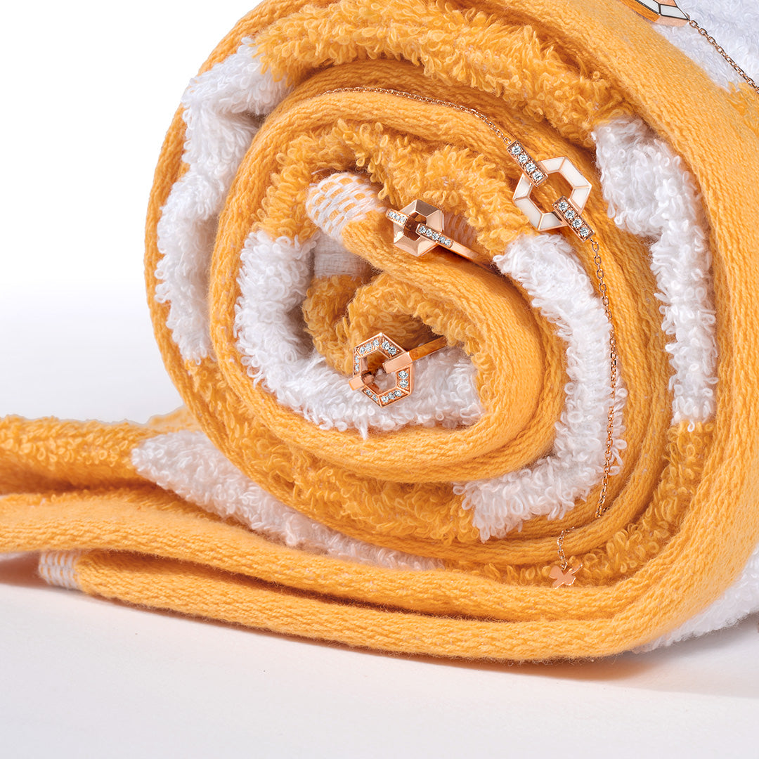 Stenzhorn’s Honey Honey collection takes the honeybee’s hexagon motif to new heights. It is made in white and warm rose gold and features baguette-cut diamonds. As the Bee Mine Collection evolved, the honeybee’s sacred structure became the focal point in Stenzhorn’s design.