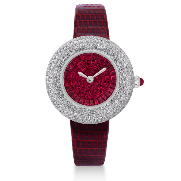 The unique movement of The Flying Carpet was achieved by applying multiple rows of micro-crankshafts and pistons to roll below the surface. The rippling rug, as soft as silk, was composed of 1,500 colour stones – from emeralds, rubies, sapphires and diamonds – set in our hand-crafted Second Skin technique to allow for total flexibility within the piece.