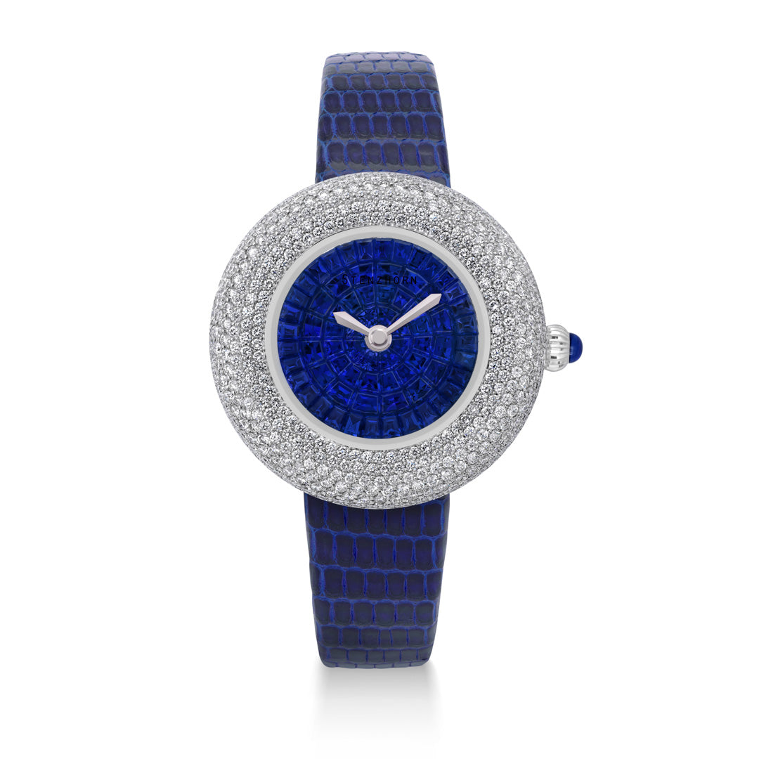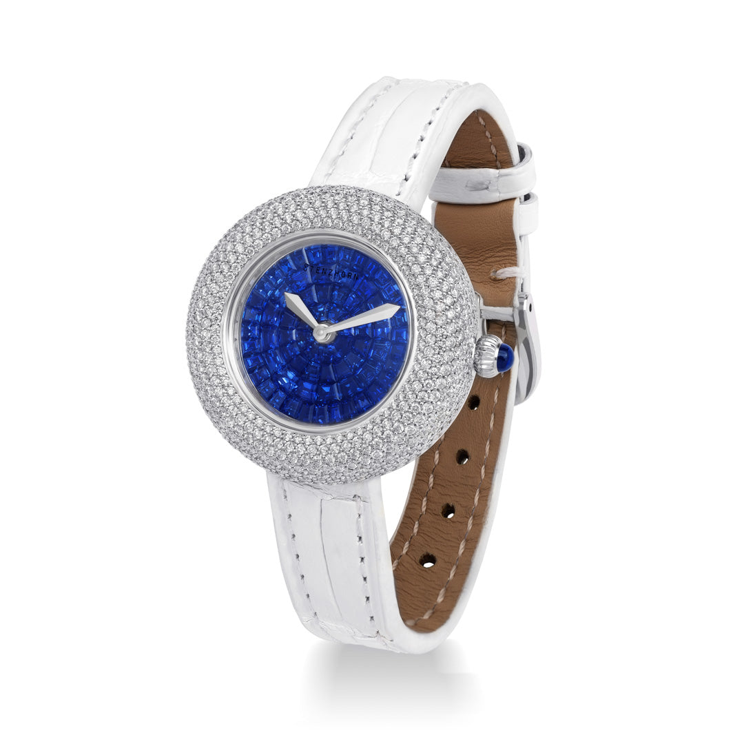 Make a bold, timely statement that makes every moment precious. Time stands still with an invisible-set blue sapphire dial framed by an 18k white gold and diamond pavé bezel.