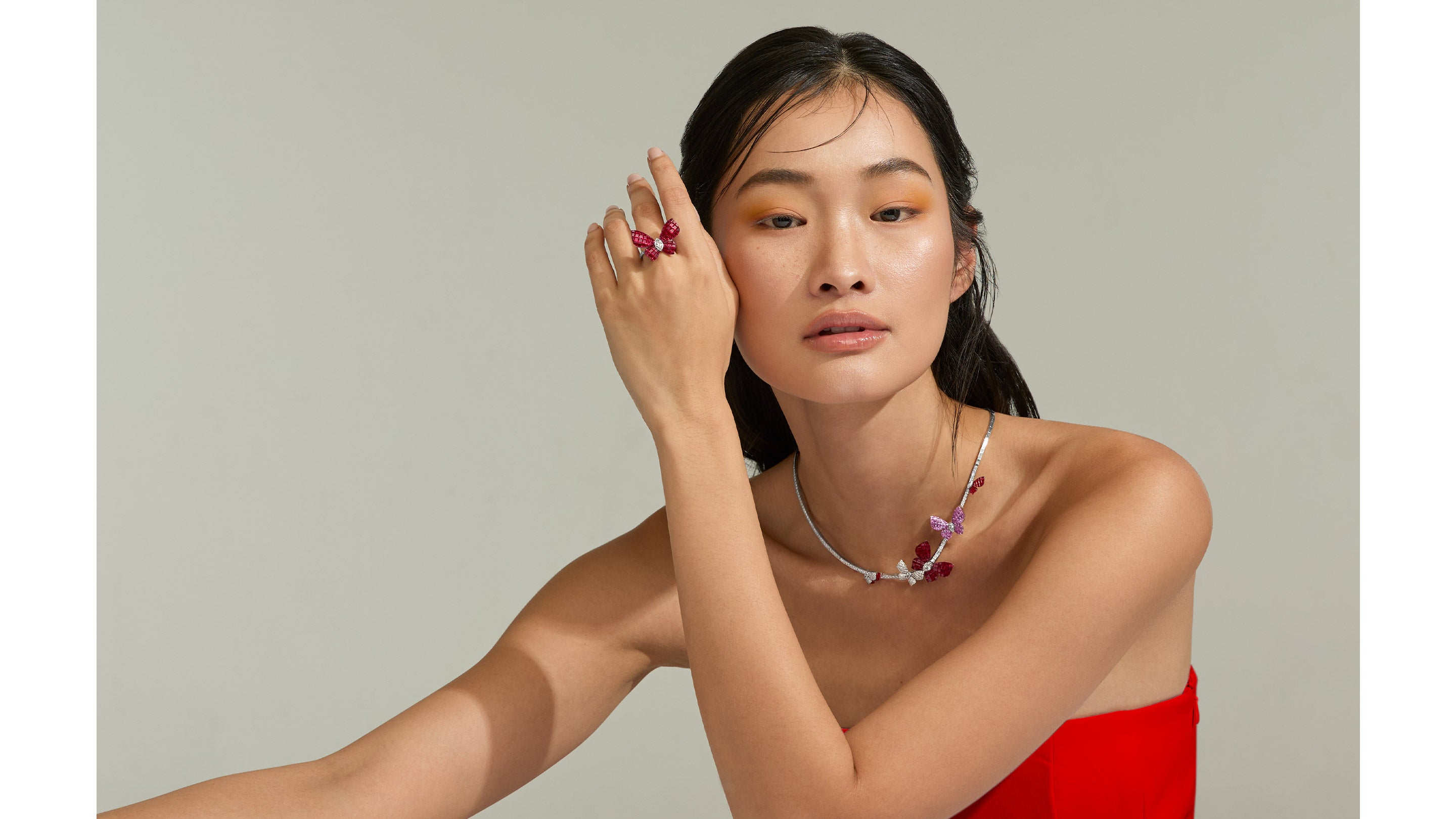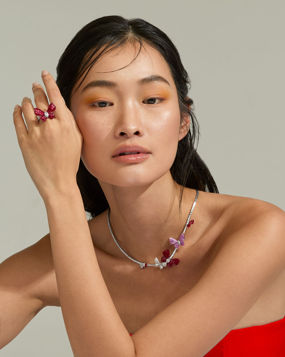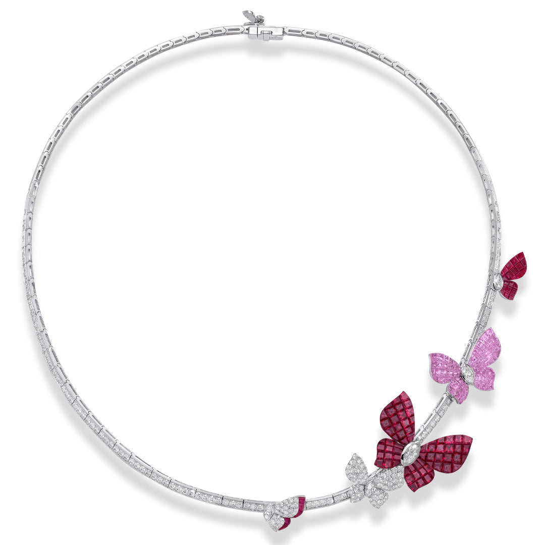 由隐形镶嵌的红宝石、粉色蓝宝石和闪亮钻石制成的精致蝴蝶在项链上翩翩起舞。Mademoiselle B.系列的设计是精湛工艺的杰作,捕捉到了轻盈、灵动和色彩的精髓--优雅与自由的诗意表达。