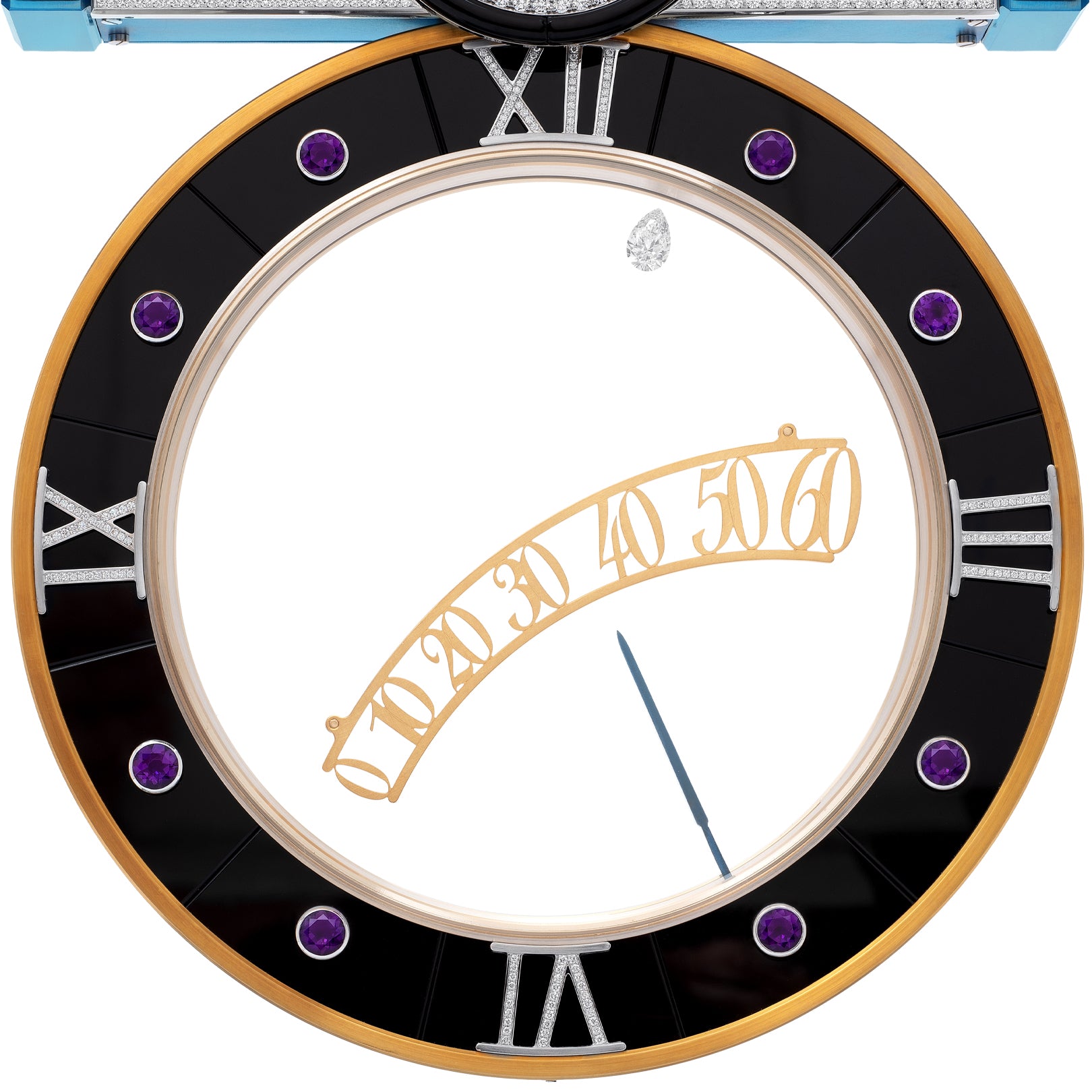 一颗悬浮的 1.5 克拉梨形钻石不断旋转以显示小时,精致的紫水晶则在表圈上标出 12 小时的位置。分钟显示确保了精确的时间测量,60 分钟后分针归零。