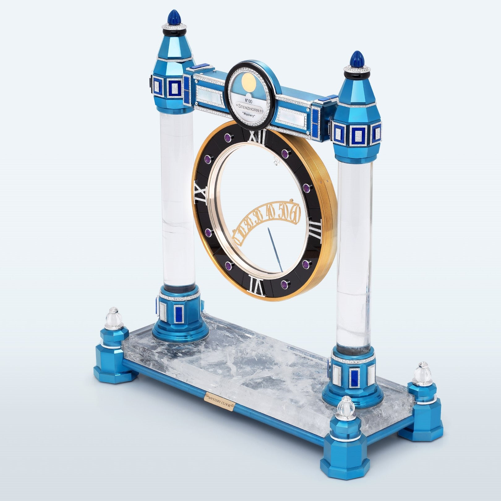 在表圈上方,昼夜显示交替显示日升月落,与小时显示完美同步。这款非凡的座钟是无与伦比的制表艺术的见证,突破了钟表物理学的极限。